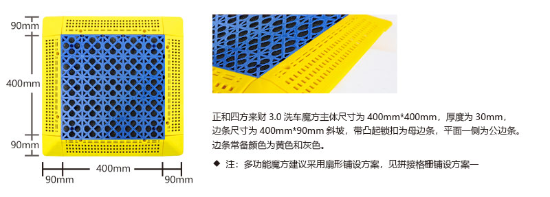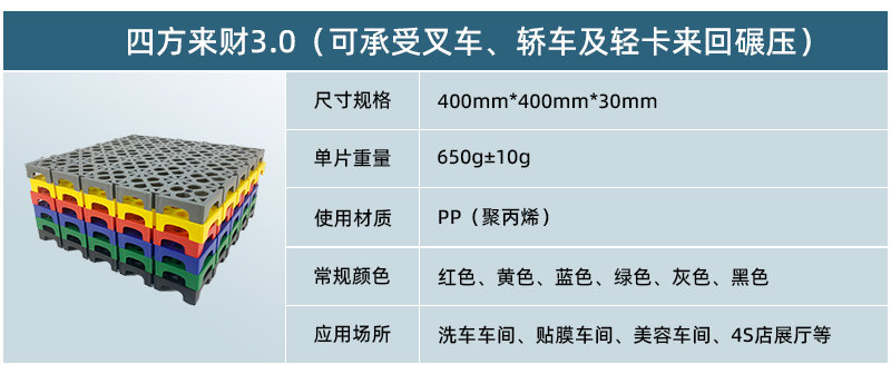 1. 分為3.4.5.厚度,解決不同厚度,統(tǒng)一紋路的問題 2. 啞光平紋設(shè)計(jì),防滑,美觀,易清潔 3. 選用高級(jí)原料,加入其他輔料,顏色亮麗,無異味,無污染 4. 顏色為紅黃藍(lán)綠黑灰六色,滿足客戶用色需求,搭配屬于自己的風(fēng)格 5. 通扣鎖扣設(shè)計(jì),容易鋪設(shè)且容易拆卸打理 6. 加強(qiáng)支撐,不容易出現(xiàn)壓壞壓斷現(xiàn)象,滿足大多數(shù)車輛施工的要求 7. 使用年限長,五年超長質(zhì)保,使用無后顧之憂 8. 十字支撐,保證承載最大化的同時(shí),且易排泥排水