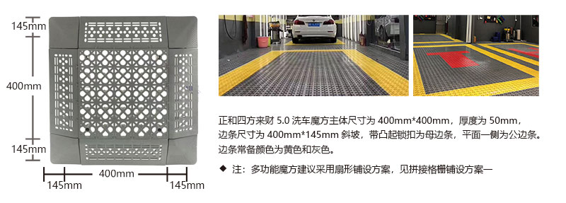 1. 分為3.4.5.厚度,解決不同厚度,統(tǒng)一紋路的問(wèn)題 2. 啞光平紋設(shè)計(jì),防滑,美觀,易清潔 3. 選用高級(jí)原料,加入其他輔料,顏色亮麗,無(wú)異味,無(wú)污染 4. 顏色為紅黃藍(lán)綠黑灰六色,滿足客戶用色需求,搭配屬于自己的風(fēng)格 5. 通扣鎖扣設(shè)計(jì),容易鋪設(shè)且容易拆卸打理 6. 加強(qiáng)支撐,不容易出現(xiàn)壓壞壓斷現(xiàn)象,滿足大多數(shù)車(chē)輛施工的要求 7. 使用年限長(zhǎng),五年超長(zhǎng)質(zhì)保,使用無(wú)后顧之憂 8. 十字支撐,保證承載最大化的同時(shí),且易排泥排水