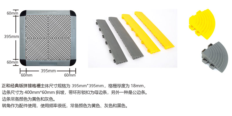 一套完整的拼接格柵產(chǎn)品由主體格柵、公邊條、母邊條、轉(zhuǎn)角四部分構(gòu)成,主體格柵的尺寸為395mm*395mm*18mm,厚度為18mm,邊條尺寸為400mm*60mm*8mm,轉(zhuǎn)角為扇形結(jié)構(gòu),尺寸規(guī)格為60mm*60mm*18mm。 拼接格柵通過(guò)一個(gè)簡(jiǎn)便互鎖接口設(shè)計(jì),重量輕,可拆卸,易于安裝。無(wú)需使用工具,即可快速構(gòu)建起堅(jiān)實(shí)的展示地板地面。 拼接格柵重量輕、結(jié)構(gòu)緊湊,便于運(yùn)輸或儲(chǔ)存?蓮V泛用作汽車4S店展臺(tái)地板、汽車美容店地面、汽車貼膜車間、美容車間以及客戶休息室等場(chǎng)所,同時(shí)也適用于展覽、展會(huì)等臨時(shí)性場(chǎng)所的地面鋪設(shè)。在幾乎所有有水的場(chǎng)所拼接格柵都能使用。