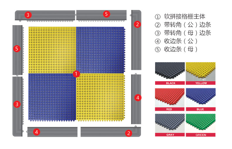 正和軟拼接格柵整體為正方形結(jié)構(gòu),采用矩陣式密集鎖扣連接,扣接牢固,施工簡(jiǎn)單,多種色彩可供搭配,鋪設(shè)之后整齊美觀。產(chǎn)品整體采用軟性材料,讓清掃衛(wèi)生變得更加簡(jiǎn)單,只要將整體地面卷起即可清理下方地面,高效便捷。
