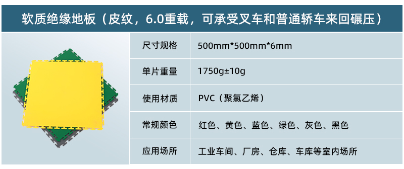 5、高承載,更防滑: 軟質(zhì)絕緣地板為實(shí)心結(jié)構(gòu),只要地面承重沒(méi)有問(wèn)題,其承載能力能夠達(dá)到每平米10噸以上。地板表面在生產(chǎn)過(guò)程中帶有凸起的紋路,讓車間地面更為防滑。