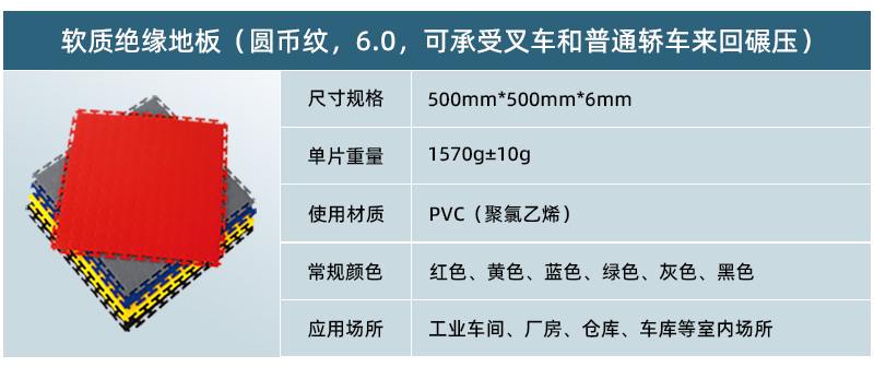軟質(zhì)絕緣地板采用純新軟性PVC(聚氯乙烯)生產(chǎn)而成,具有防滑、防油、靜音、抗沖擊、高承載等特點(diǎn),可以快捷安裝在任何現(xiàn)有的基板,包括木材,混凝土,環(huán)氧樹脂,瓷磚,水磨石等,廣泛應(yīng)用于車間廠房地面、倉庫地面、車庫地面、健身房、展廳等場所。