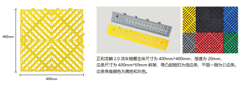 1.龍鱗紋設(shè)計,防滑,美觀,寓意好 2.選用高級原料,加入其他輔料,顏色亮麗,無異味,無污染 3.顏色為紅黃藍綠黑灰六色,滿足客戶用色需求,搭配屬于自己的風格 4.通扣鎖扣設(shè)計,容易鋪設(shè)且容易拆卸打理 5.加強支撐,不容易出現(xiàn)壓壞壓斷現(xiàn)象,滿足大多數(shù)車輛施工的要求 6.使用年限長,3年超長質(zhì)保,使用無后顧之憂 7.不同厚度,采用不同支撐,保證承載最大化的同時,且易排泥排水